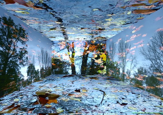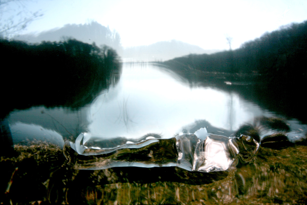 La série "Paysages réfléchis" (2006) par un dispositif en plexiglas, superpose deux réalités: