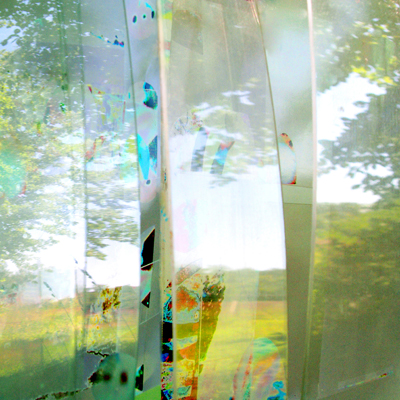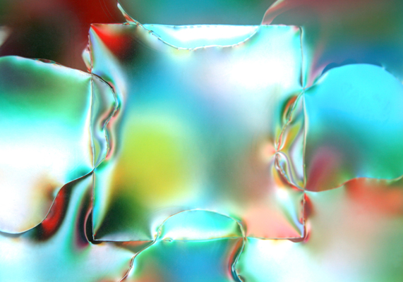 Dans la série "Reflets composés"(2007) un dispositif est conçu pour" fabriquer des reflets" et la photographie en restitue les possibilités. L'artiste fouille plus encore sa passion pour le formalisme abstrait et l'approche sensible des phénomènes colorés.
